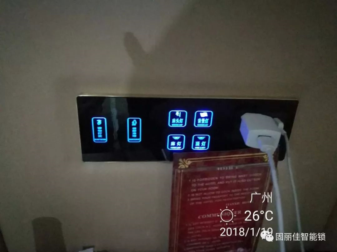 采用固麗佳智能門牌觸摸開關——LED背光觸摸式燈位指示一目了然。方便夜間識別,提高酒店高效、便捷的服務質量,提升了顧客滿意度!